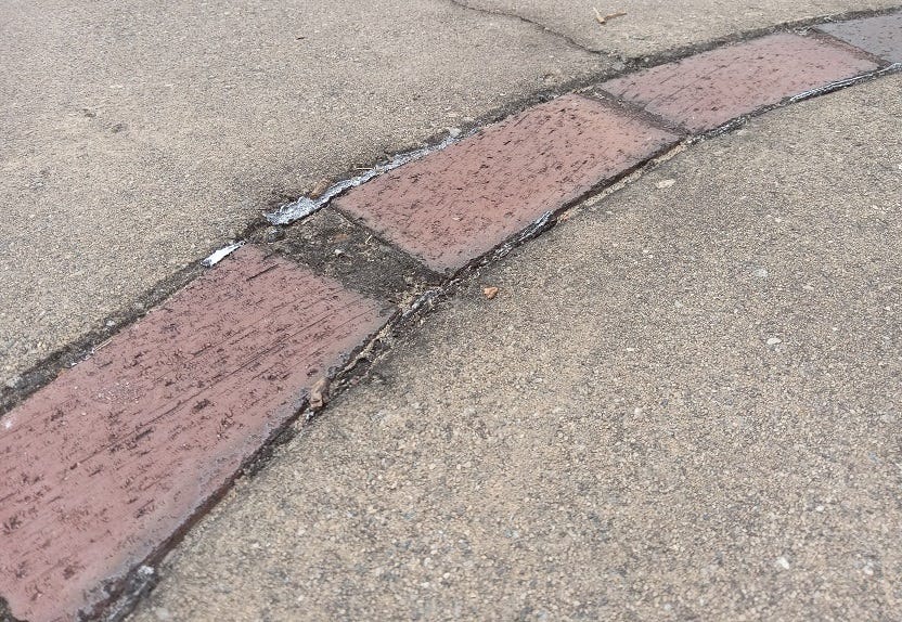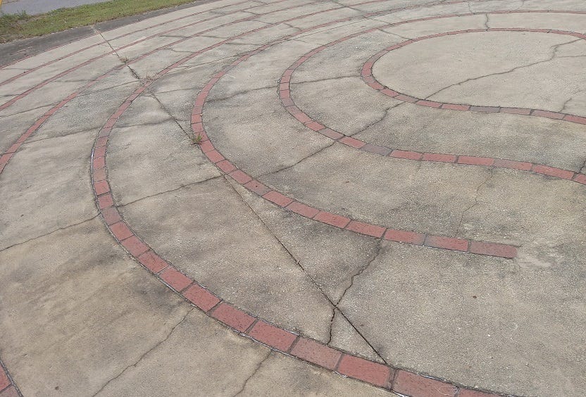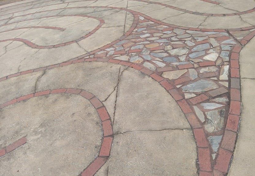 The surface of the labyrinth is pebbled concrete, lined and cracked. Its path is defined by borders of bricks. Its colors are subdued, like those you’d see on a rainy day. There’s a little decorative smattering of flagstone pavers in one spot and the center bulbs open like the central chamber of a fox den.