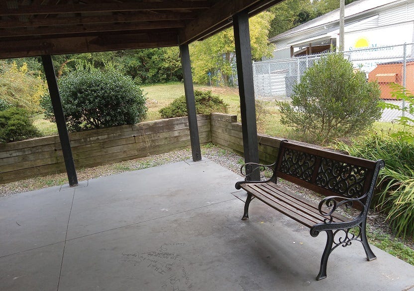 Walking the labyrinth is mostly a solitary activity, though I have taken a friend along now and then. On its border is a long wooden bench and arbor, and beside that, a small park and shelter that’s sometimes used, I perceive, by those who have no other home. Sometimes there’s industrial noise from a machine shop across the street.